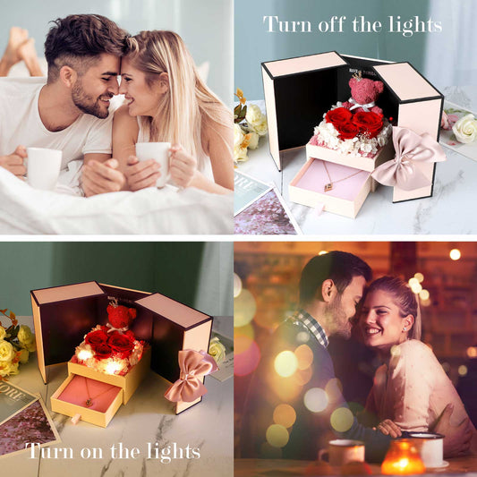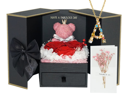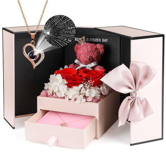 ADDWel Red Preserved Flower Gift Box with Heart-Shaped ‘Mom’ Silver Necklace & Adorable Bear - Top-Ranked Mother’s Day Gift